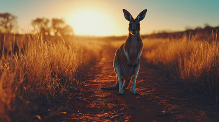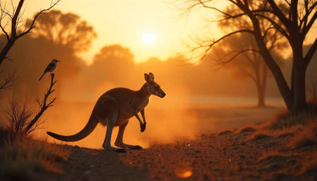 Kangaroo and bird silhouetted in a golden Australian sunrise