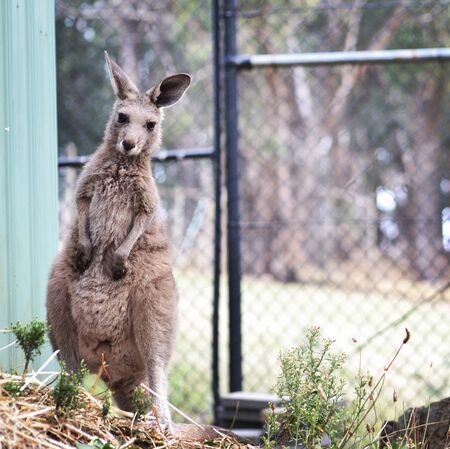 Kangaroo waiting fo food in a zoo, a leaping mammal of Australia and nearby islands that feeds on plants