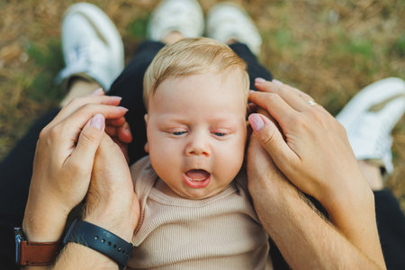 baby looking aside sitting on her mother hands