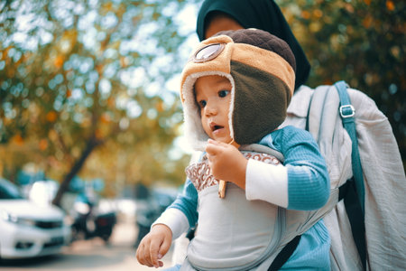 Baby boy being carried by his mother in a sling