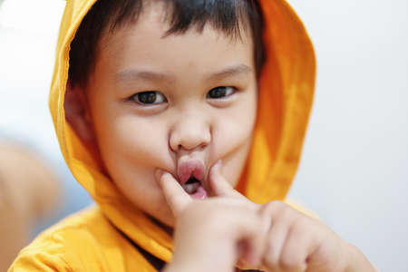 Portrait of a cute little asian boy with his mouth open