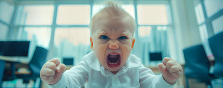 Furious infant entrepreneur vociferating within corporate confines of an office setting. Concept Baby CEO, Office Tantrums, Business Babes, Mini Moguls