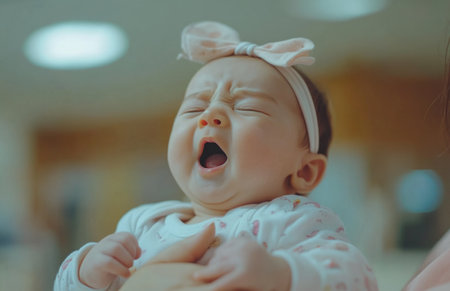 A precious newborn girl yawns and cries while being gently held by her mother
