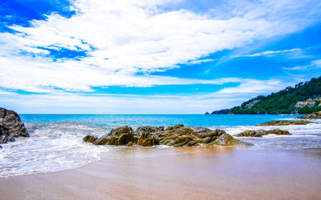 Amazing rocky Kalim Beach tropical landscape panorama view with blue sky turquoise water waves and rocks in Patong Beach Kathu District Phuket Island Province Southern Thailand in Southeast Asia.