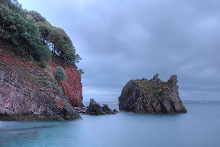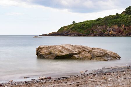Smooth, calm sea around a shoreline rock at St Mary's Bay beach in Torbay, Devon, with some coastline cliffs in the background, part of the English Riviera stretch of coastline. Long exposure image.