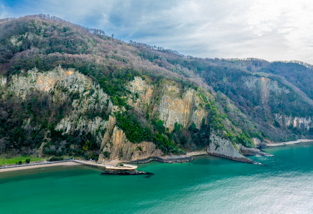 Candas. Steep rocky ocean shore. Part of the famous Costa Verde beach. Atlantic coast, Spain. Mild autumn weather. Romantic trip to Spain.