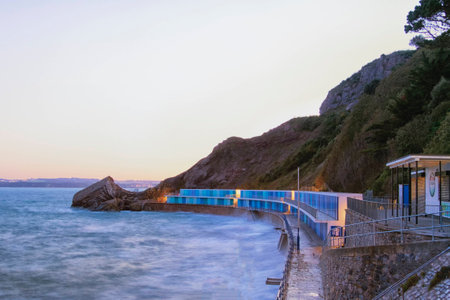 Bright blue beach huts at Meadfoot Bay, Torquay, Devon, England at sunset. Long exposure of waves crashing against the sea wall.