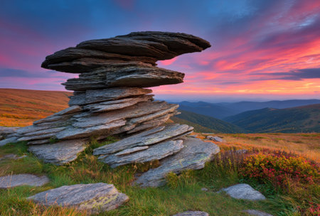 A layered rock formation sits in a meadow, silhouetted by a colorful sunset over rolling hills