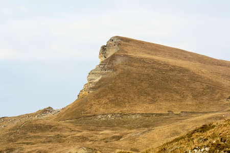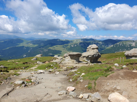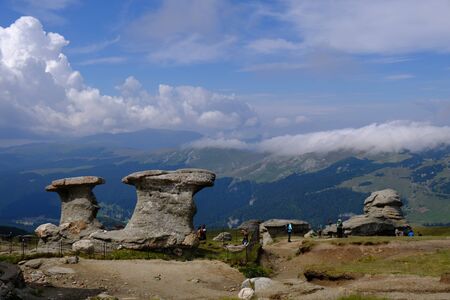 Babele Natural Monument, stone in the Bucegi Natural Park in Romania. Megaliths on top of a mountain range, tourist attraction.