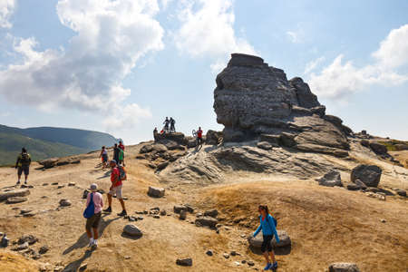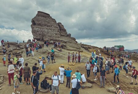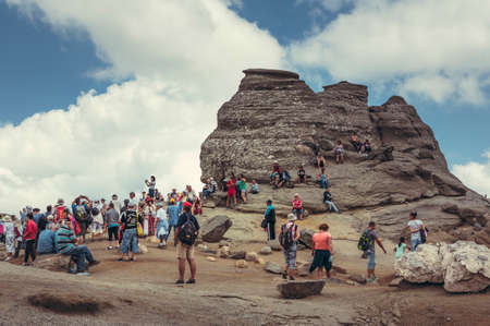 Bucegi Mountains, Romania - August 6, 2016: Thousands of tourists come to visit the Sphinx, the mythical megalith with human face resemblance located at 2,216 m altitude on Bucegi Mountains plateau.