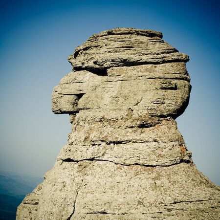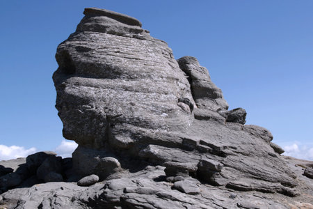 Close-up photo of the Sphinx stone against a blue sky in the Bucegi national park in Busteni, Romania