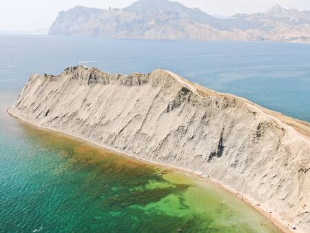 CRIMEA AUGUST 2019 Chameleon cape in Koktebel bay Cape changing a color depends day time Aerial view