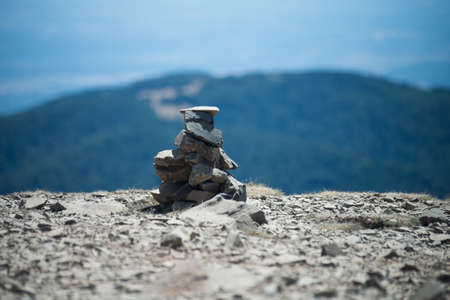 Signposts and piles of stones on a hiking trail. Fagaras. Romania.