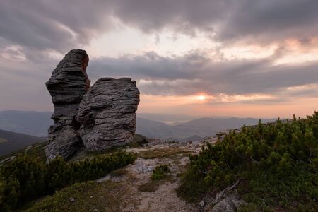 Bucegi, Romania. Beautiful sunset with Sphinx, natural rock formation in Carpathian Mountains, famous landmark of Romania.