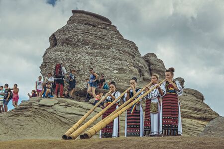 Bucegi Mountains, Romania - August 6, 2016: Young Romanian women dressed in colorful traditional costumes play the tulnic near the Sphinx megalith in Bucegi mountains.