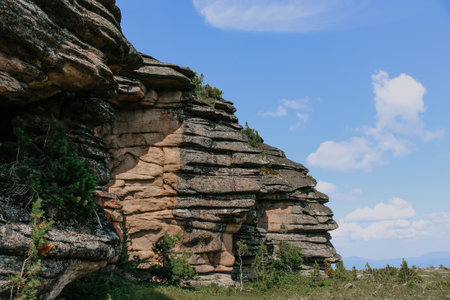 Low syenite rock igneous mountain formation. cooled layers of magma. Natural Climbing training area in forest. Tourist attraction