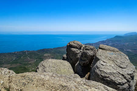 View of the Black Sea and stone conglomerates from the top of the Demerdzhi mountain.