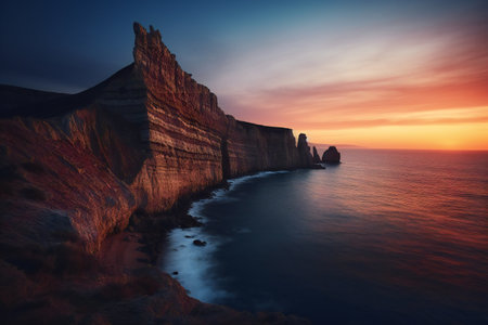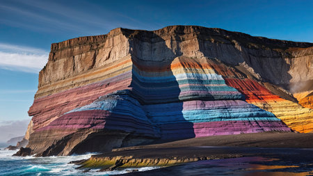 Vibrant layers of colored rock rise majestically from the ocean, illuminated by the setting sun's warm glow.
