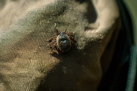 Tick is crawling on a backpack, highlighting the risk of lyme disease and other tick-borne illnesses during outdoor adventures, emphasizing the importance of tick checks and preventive measures