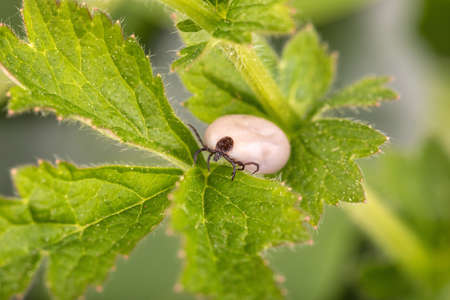 Engorged tick on a green leaf. Lyme disease caused by borrelia.