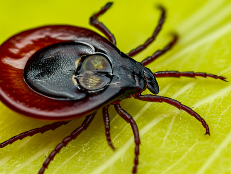 Close up microscopic view revealing parasitic tick crawling across bright green grass blade, highlighting risks of lyme disease transmission in outdoor wilderness settings