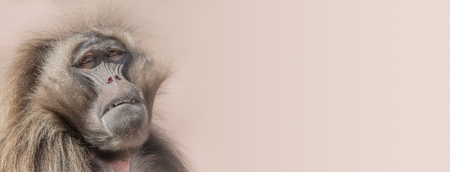 Portrait of depressed African baboon at smooth background, extreme closeup