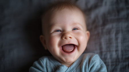 Close-up of a Joyful Baby Laughing and Looking Upwards with Bright Eyes on a Soft Gray Surface