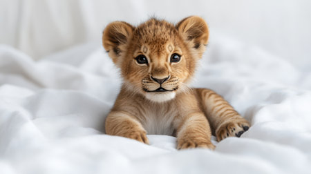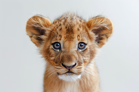 Adorable lion cub sitting on a white backdrop, big curious eyes, fluffy fur, playful expression, soft lighting, ultra-detailed, heartwarming vibe