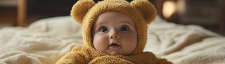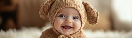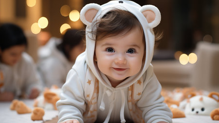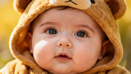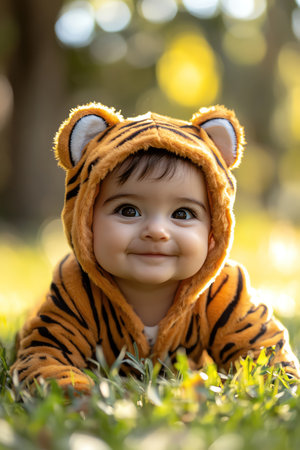 This charming image features a smiling baby dressed in an adorable animal costume. The warm colors convey joy and innocence, perfect for family-oriented projects.