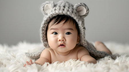 A peaceful and serene image of a newborn baby resting on a fluffy white rug wearing a charming animal themed hat The soft grey background provides a minimalist and calming atmosphere allowing the
