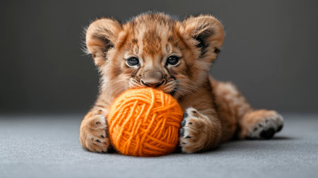 Cute little lion cub playing with a ball of yarn on grey background