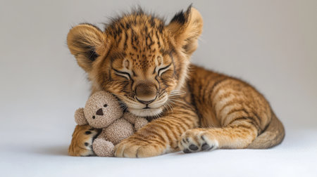 Lion cub gently holding a small stuffed animal, nurturing and sweet, white background, soft textures, heartwarming and tender