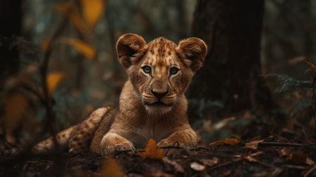 Lion cub lying on the ground in the forest, looking at camera