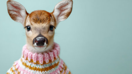 A delightful young fawn in a cozy sweater poses charmingly against a soft pastel background, capturing a unique blend of wildlife and fashion in a playful indoor atmosphere.