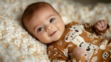 A baby lies on a soft blanket, sporting a cute outfit with playful animal designs. The infant beams with joy, creating a warm and loving atmosphere in the home.
