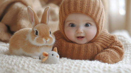 A delighted baby dressed in a warm, knitted outfit smiles joyfully while sitting beside an adorable rabbit and a small stuffed mouse, surrounded by soft, inviting textures.