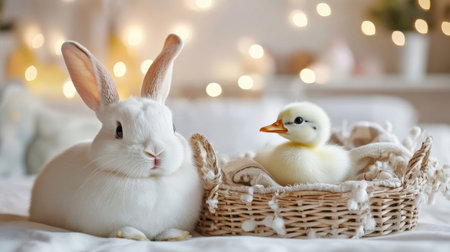 A charming scene featuring a fluffy white rabbit and a cute yellow duckling nestled together in a woven basket. The soft, warm background with twinkling lights adds a magical touch to this delightful moment of friendship