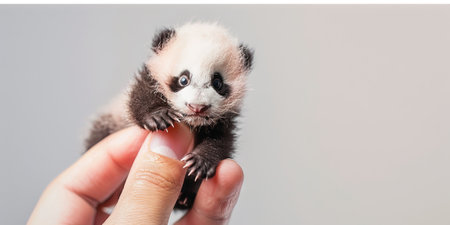 A small baby elephant sits comfortably in cupped hands, displaying its big eyes and soft skin with little tusks.