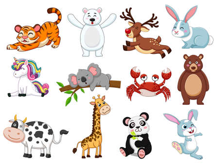 Cute cartoon animals collection isolated on white background. Vector illustration.