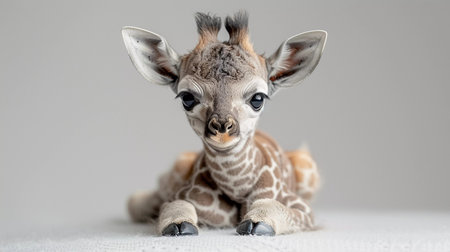 A young giraffe lies comfortably in front of a soft grey background, looking directly at the viewer with soulful eyes and distinctive facial markings. This portrait captures the unique beauty and grace of giraffe calves.