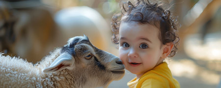 Baby at a petting zoo, feeding a gentle goat, curiosity and excitement