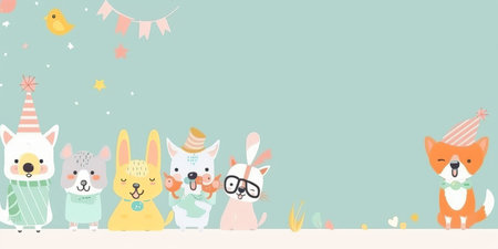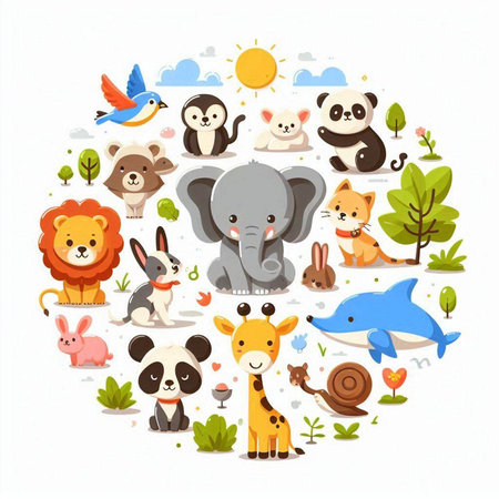 A delightful scene featuring cute cartoon animals gathered together in a vibrant forest setting, illuminated by soft sunlight. Perfect for children's themes.