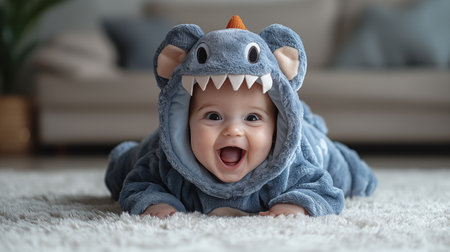 Adorable baby in a bee costume, smiling and lying on a bed, with bright blue eyes and a cute expression