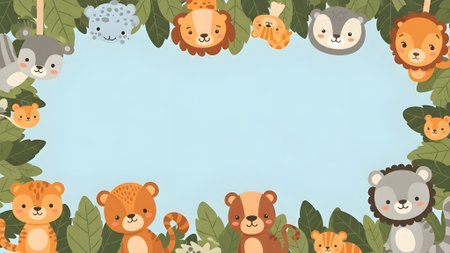 A charming lineup of young animals: lions, giraffes, zebras, and meerkats, showcasing playful expressions.