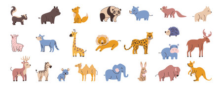 Mammals, representatives of vertebrates on Earth for children. Vector wolf, bear and giraffe, moose and skunk, kangaroo and zebra, elephant and lion, fox and panda, deer and bison, rabbit and camel