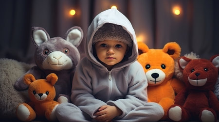 Portrait of 10 years a baby in an animal costume with plush toys.