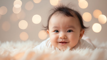 A close-up portrait of a happy, smiling baby lying on a soft, fuzzy surface. The image is accented by blurred bokeh lights in the background, creating a warm and inviting atmosphere.