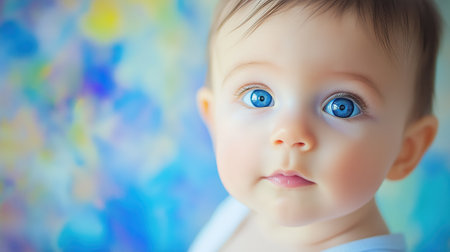 Close Up Portrait of a Happy Baby Smiling with Bright Blue Eyes Surrounded by a Colorful Background