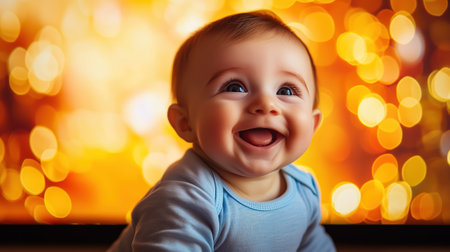 Happy baby smiling against a warm, golden bokeh background, creating a soft and joyful atmosphere.