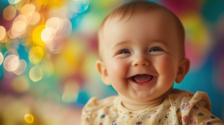 Joyful baby laughing against a vibrant, colorful bokeh background, capturing a playful and cheerful mood with bright lighting.